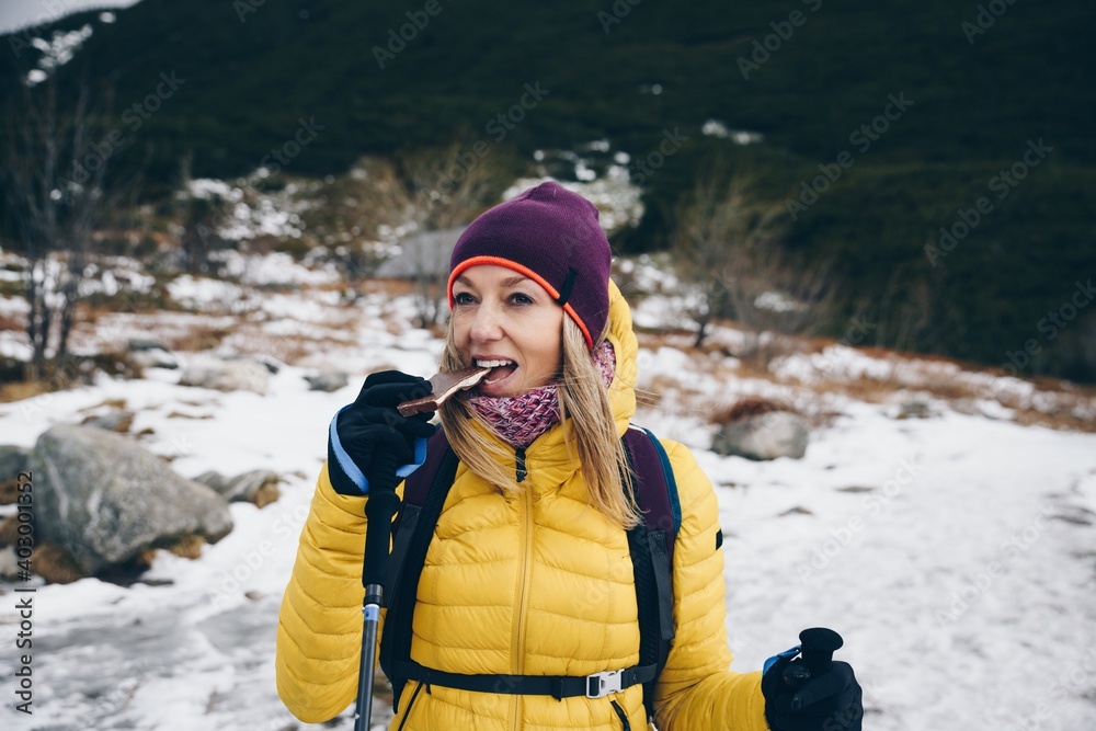 A blonde hiker on a mountain hiking trail is eating chocolate with Nordic walking poles.