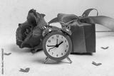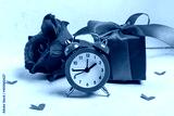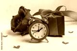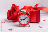 Valentines Day greeting card red alarm clock, gift box, flower rose on gray background