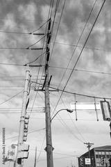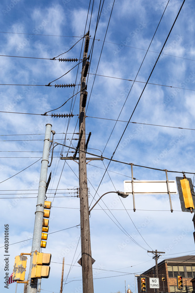 Composition of very tall power pole, traffic signals, and power lines before blue sky with light clouds, vertical aspect