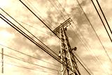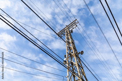 Industrial composition with power lines and vintage metal tower, blue sky with light clouds, horizontal aspect