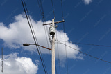 Light wood power pole with transformer and street light before a deep blue sky with white puffy clouds, horizontal aspect