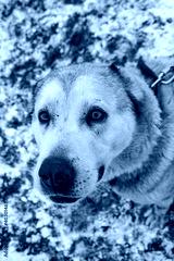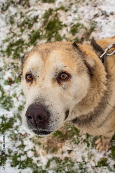 Dog beige in the yard on a chain looks into the camera amid the grass in the snow