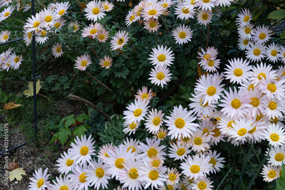 Beautiful white daisies in a garden, floral background with creative copy space, horizontal aspect