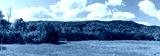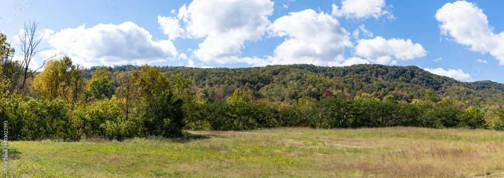 Panoramic view of a low mountain landscape, green field with trees, blue sky with clouds, horizontal aspect