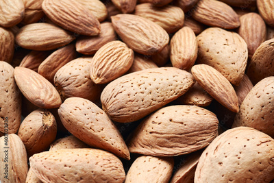 Close up picture of raw almonds in shell and shelled, selective focus.