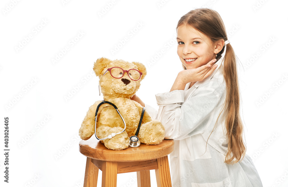 Cute girl playing in doctor profession with a bear toy. Child's hobby and future medical occupation