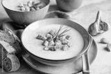 Creamy garlic soup topped with croutons and chives