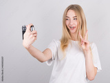 Photo of blonde girl in casual t-shirt showing peace sign and taking selfie with old camera