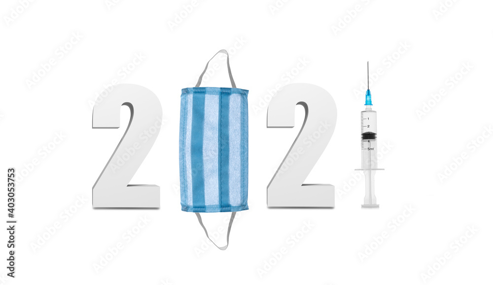Figures 2021 with medical mask and syringe. Coronavirus concept. Pandemic covid-19 in 2021.