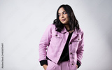 Portrait of woman In pink Looking towards its Right with suspicious expression