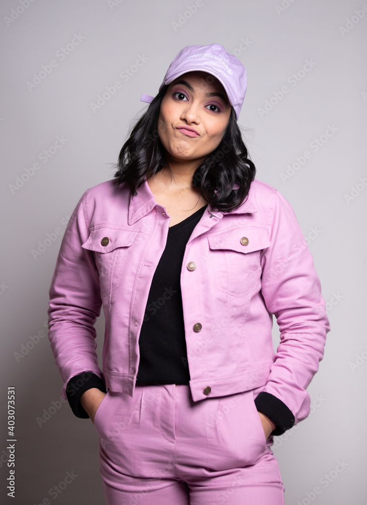 Portrait of woman In pink Outfit with cap With confusing Expression