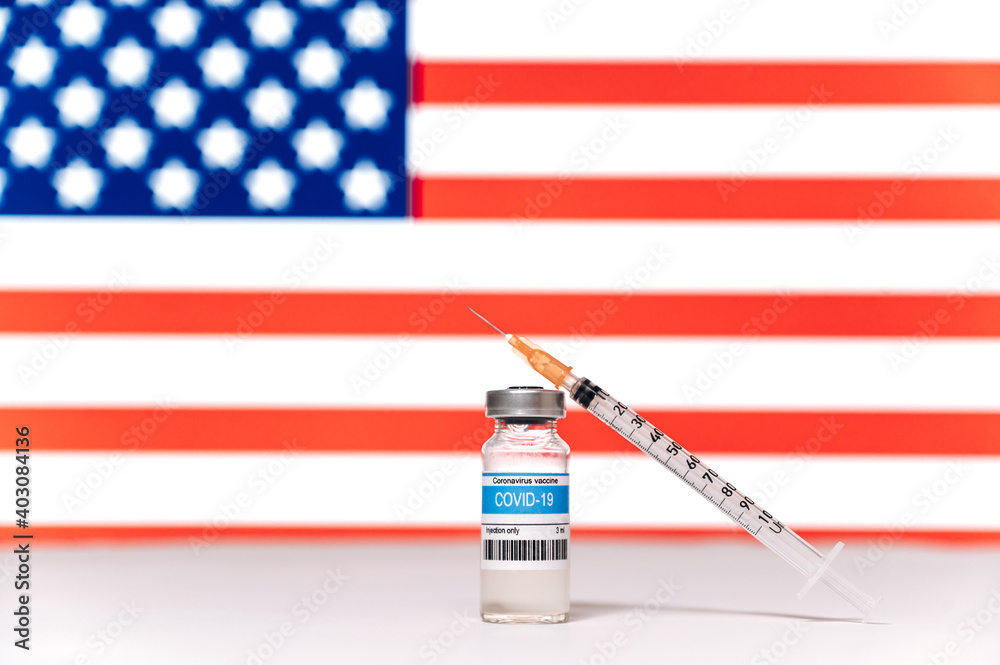 Ampoule with COVID-19 corona virus vaccine and syringe for injection on USA flag background. Coronavirus vaccine manufacture in USA, worldwide vaccination and healthcare concept
