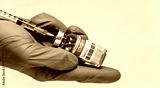 Close-up panoramic photo of a doctor's hand in medical glove holding syringe and ampoule with COVID-19 corona virus vaccine injection. Coronavirus prevention, healthcare concept. Blue background