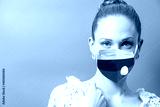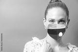 Portrait of young woman wearing face protective mask with Flag of Russia