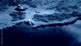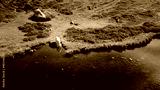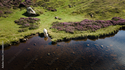 White sheep drinking fresh crystal clear water from a lake while grazing on green pasture with blooming purple heather around