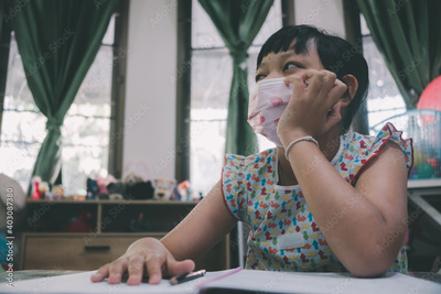 Bored asian student studying at home.Coronavirus Outbreak. Lockdown and Online education concept
