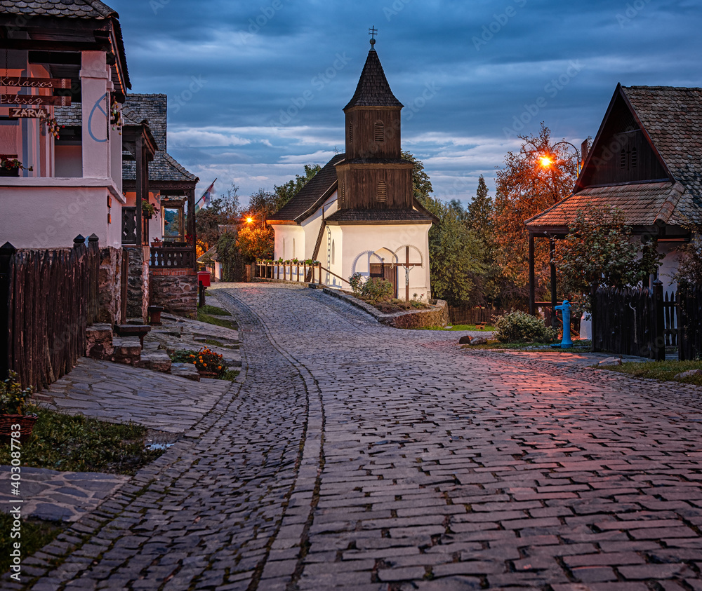 White temple and traditional stone houses in the old town of Holloko, Hungary