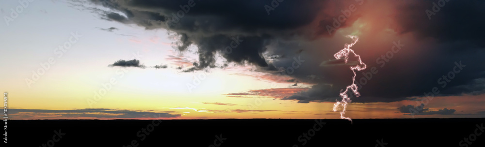 Sunset in Sweden (Sandared). Dramatic cloudscape with a pink, yellow thunderbolt shooting from the sky. Climate change with powerful weather.