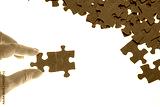 puzzle pieces are scattered on a white background, difficult task, the hand connects the puzzle pieces