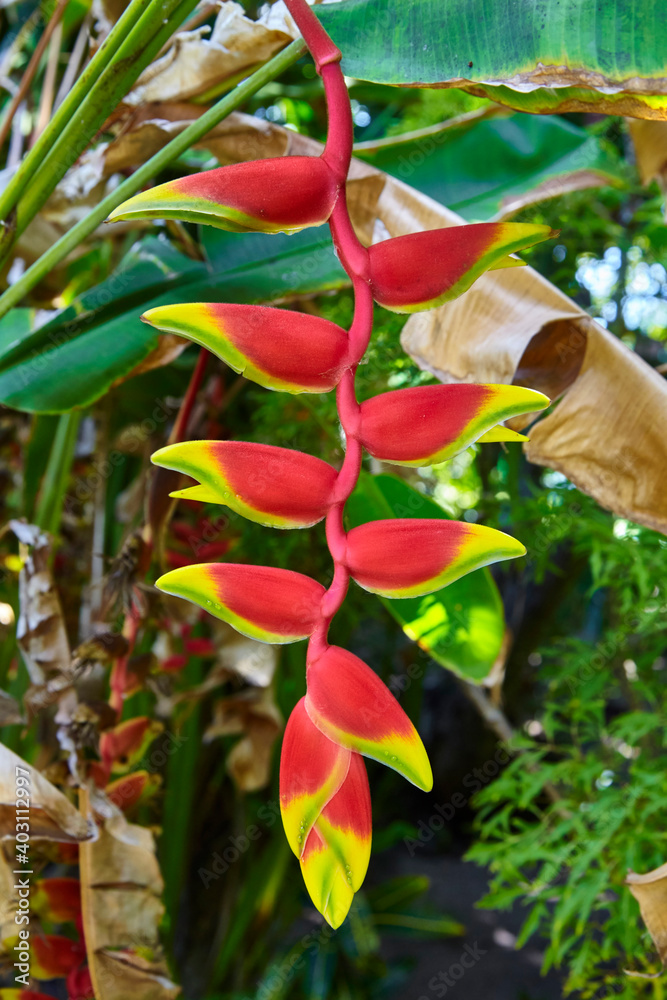 Beautiful colored Heliconia rostrata, (tropical flower).