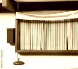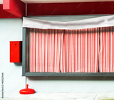 red fire drencher on blue wall next to closed ice cream shop front, yellow and white textured cotton curtain behind window glass.