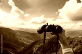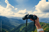 Hands holding binoculars on mountains forest nature background, looking through binoculars, travel, search and search concept.