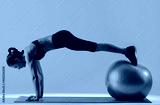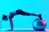 one mixed races woman exercsing fitness pilates exercices isolated on blue blackground