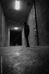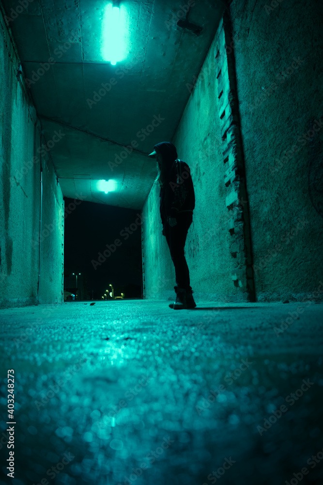Lonely woman walking in a dramatic mystic dark alley at night. Danger and scary concept.