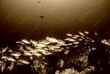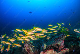 School of colorful blue stripe snapper on a tropical coral reef in Thailand's Andaman Sea