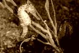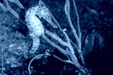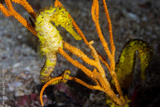 Pair of yellow Tiger Tail Seahorses on a dark tropical coral reef