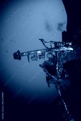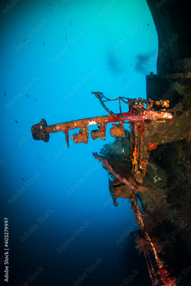 A large, upturned shipwreck on the sea floor near a tropical coral reef