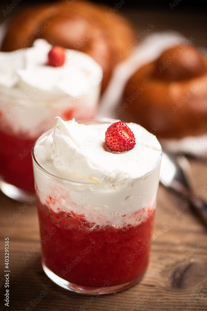 A delicious breakfast with strawberry granita and brioches, sicily