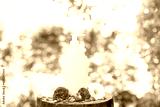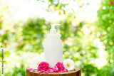 white bottle with natural cosmetic product lotion or shampoo with fresh herbs and flowers on wood background, Beauty, skin, hair or body care concept