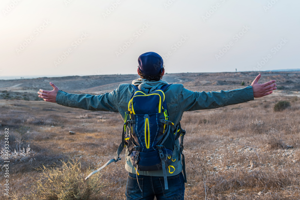 Traveler man standing in freedom with arms up happy and looking beautiful view landscape, at sunset.