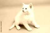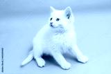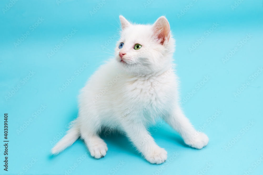 Small white kitten with blue and green eyes sitting on blue background and looking sideways