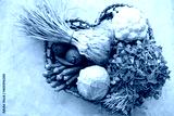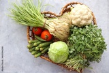 Assorted organic vegetables in a heart shaped wooden basket. Fresh uncooked vegetable. cabbage, cauliflower, green garlic, fenugreek, okra, tomatoes, capsicum, beetroot, and lemon.