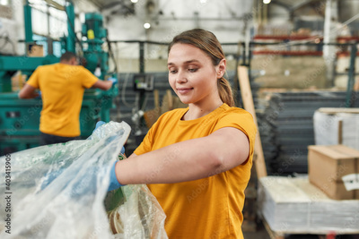 Smiling young girl putting plastic into bag