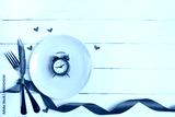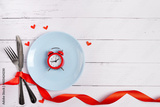 alarm clock on blue plate with red hearts, table knife and fork, wooden background with copy space