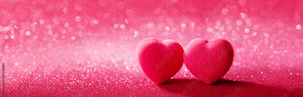 Two Hearts on top of Pink Glitter In Shiny Bokeh Background - Valentine's Day Concept