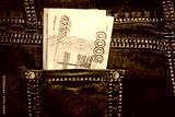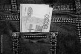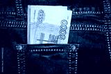 A stack of Russian five-thousandth ruble bills in a pocket of blue jeans. Money in your pocket, cash. Travel concept.