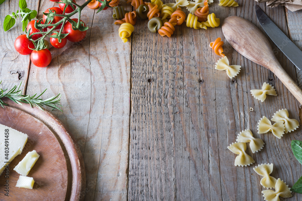 Abstract background ingredients for making pasta with various tomatoes pasta cheese and spices on a wooden rustic table. Italian food