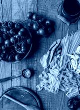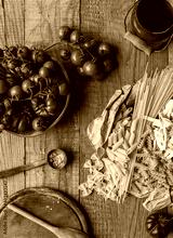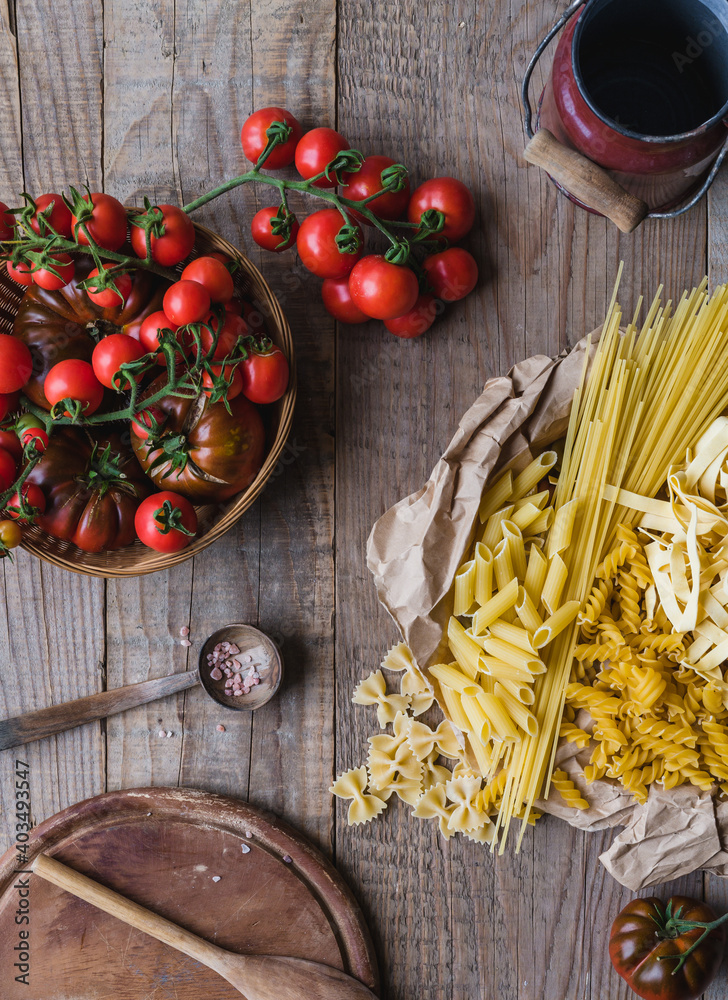Abstract background ingredients for making pasta with various tomatoes pasta cheese and spices on a wooden rustic table. Italian food