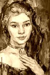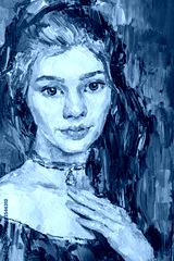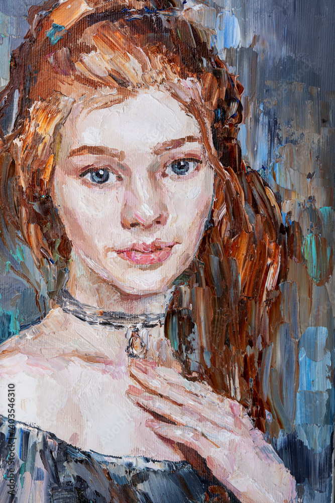Young beautiful girl. Created in the expressive manner. Palette knife technique of oil painting and brush.