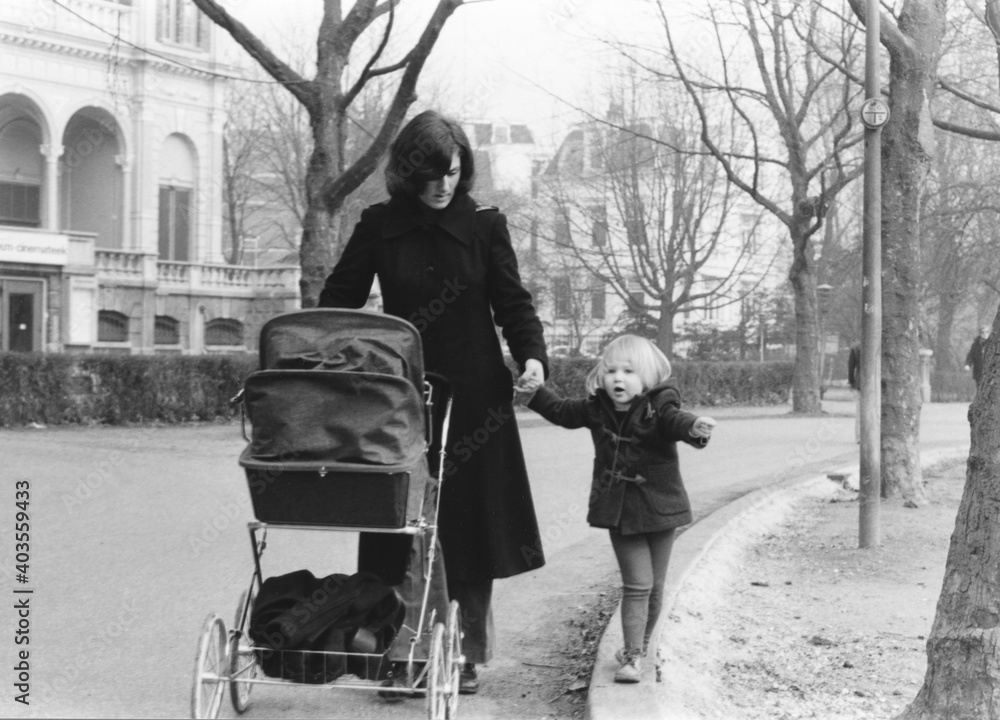 1976 vintage monochrome image of a mother with a long black coat walking hand in hand with her daughter and pushing a classic pram in Vondelpark, Amsterdam, The Netherlands.