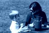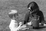 Vintage 1978 color image, young motherwith sunglasses talking with and looking at her son having a roadside picnic with retro red thermos.