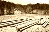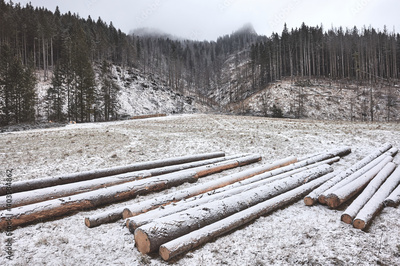 Mountain landscape with timber logs on a snowy day, Koscieliska Valley, Tatra National Park, Poland.
