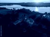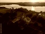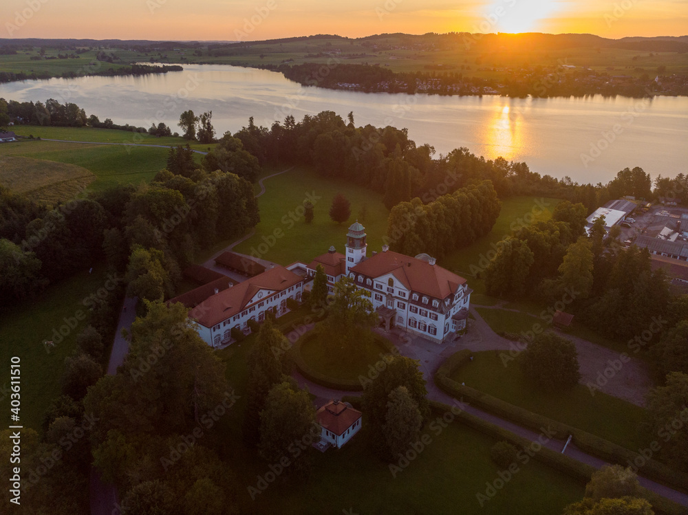 Luftbild bei Sonnenaufgang vom Schlolß Neu-Egling mit Riegsee im Hintergrund