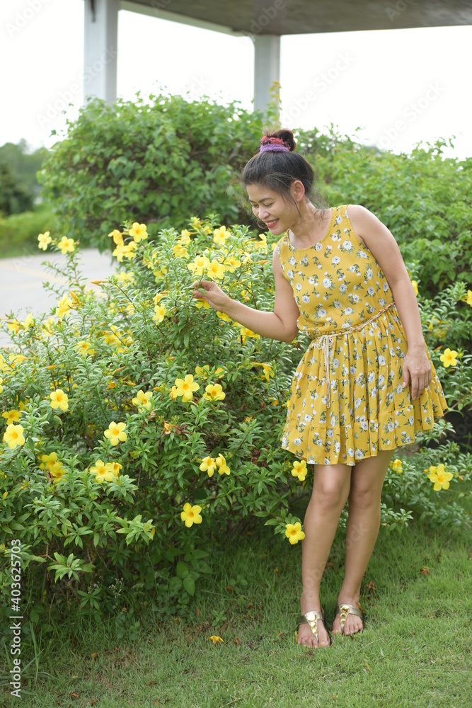 A beautiful middle-aged woman with beautiful flowers in the garden.
