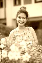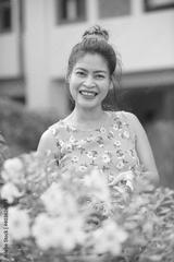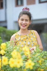 A beautiful middle-aged woman with beautiful flowers in the garden.