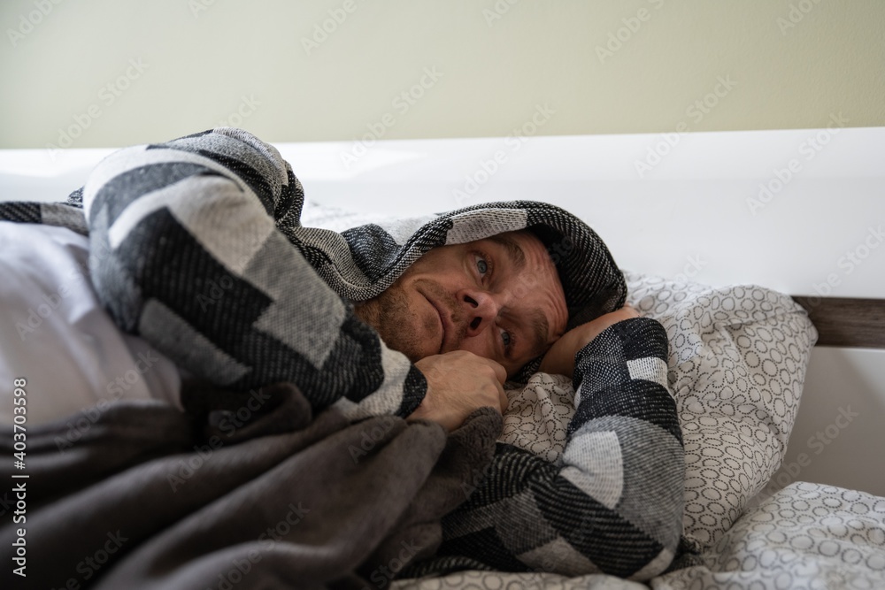 Depressed man lying in his bed and feeling bad. He can't sleep.